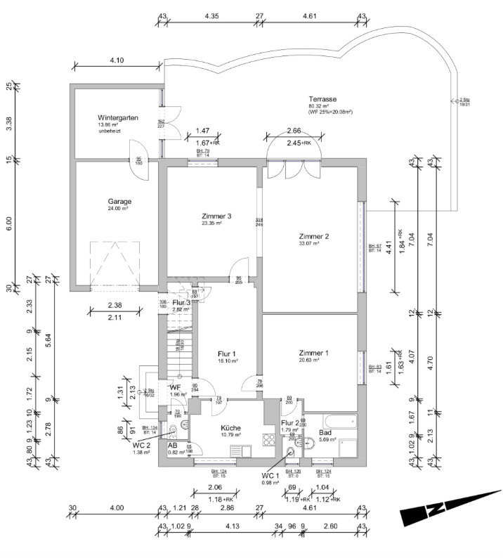 Das ca. 120 m² große Erdgeschoss ist mit Stäbchenparkett ausgelegt und bietet ein sehr großes Wohn-/Esszimmer mit Terrassenzugang sowie zwei weitere Zimmer. Die Küche ist mit einer Einbauküche nebst Speisekammer ausgestattet. Das geflieste Badezimmer verfügt über eine Eckbadewanne sowie eine Dusche, das WC ist separat. Die liebevoll angelegte, ca. 80m² große Terrasse beinhaltet auch einen überdachten Terrassenbereich von ca. 14m² und umschließt den gesamten hinteren Bereich des Gebäudes mit einem traumhaften Blick in den idyllischen Garten, der viel Privatsphäre bietet.