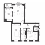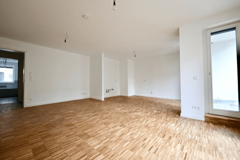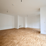 Die Wohnung befindet sich im Hochparterre. Vom Eingangsbereich erschließt sich das ca. 35 m² große Wohn-/Esszimmer mit offenem Küchenbereich sowie Zugang zum südwestlich ausgerichteten Balkon zum Gartenbereich.