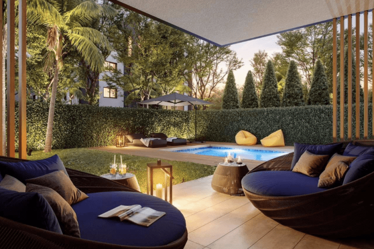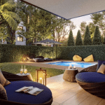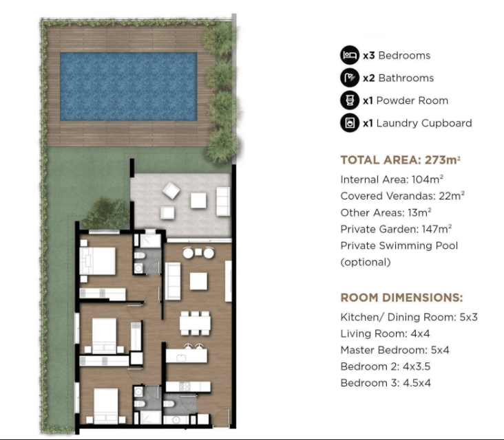 Es stehen schöne Apartments mit geräumigen und offenen Wohnbereichen, ein bis drei Schlafzimmern sowie große Terrassen oder private Gärten mit eigenem Pool zur Verfügung.