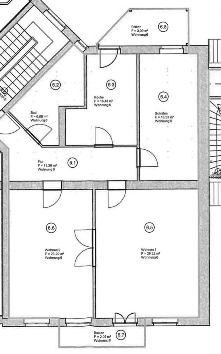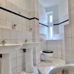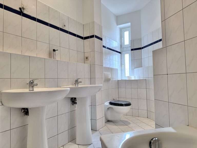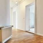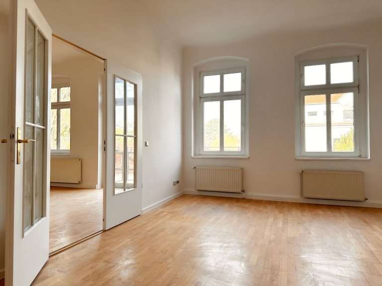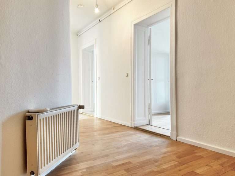 Auf ca. 110 m² verteilen sich ein Flur; ein großzügiges, tagesbelichtetes Badezimmer mit zwei Waschbecken und einer Badewanne; eine geräumige Küche, mit Zugang zu einem Balkon sowie drei Zimmer, wobei eines der Zimmer Zugang zu einem weiteren Balkon hat und zudem mit dem danebenliegenden Zimmer durch eine Flügeltür verbunden ist.
