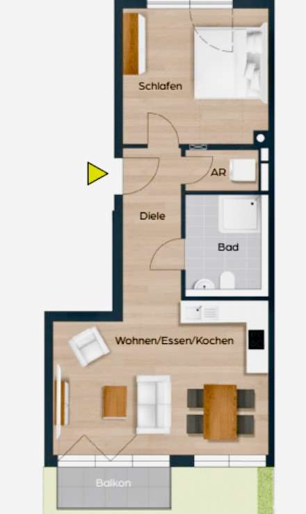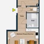 Die lichtdurchflutete Wohnung verfügt über ca. 58 m² und teilt sich auf in einen Eingangsbereich, einen praktischen Hauswirtschaftsraum, ein Badezimmer mit Dusche, ein Schlafzimmer sowie einen großen Wohn-/Essbereich. Die Einbauküche ist im Wohn-/Essbereich integriert. Ein Balkon mit südlicher Ausrichtung ist von diesem Bereich zugänglich.