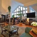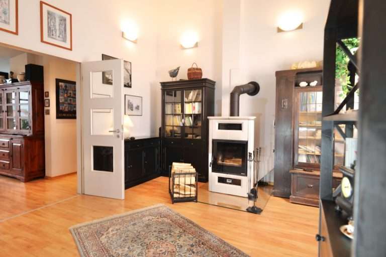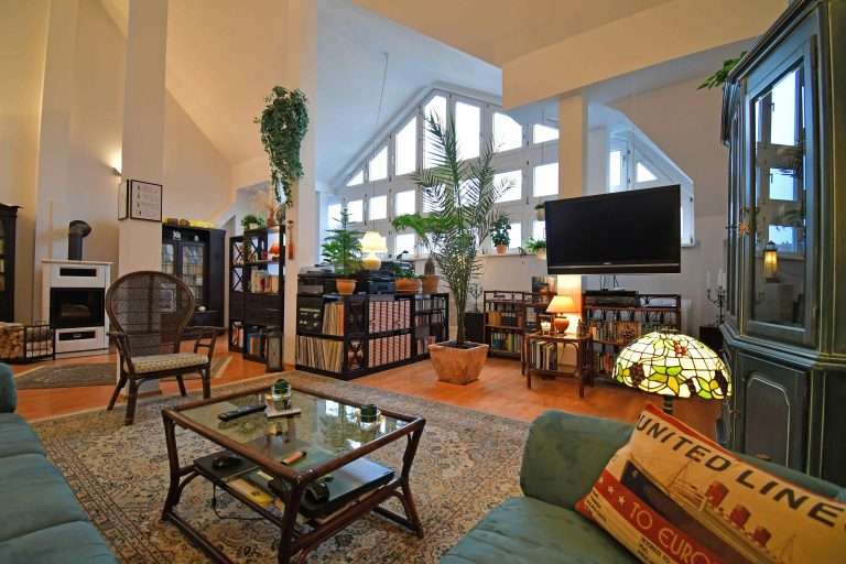 Das Highlight der Wohnung ist der imposante Wohnbereich mit einer großflächigen Fensterfront und einer beeindruckenden Deckenhöhe von ca. 6,50 m. Diese schafft ein außergewöhnliches Raumgefühl und eine lichtdurchflutete Wohnatmosphäre. Ein schöner Kaminofen ist hier ebenfalls vorhanden.