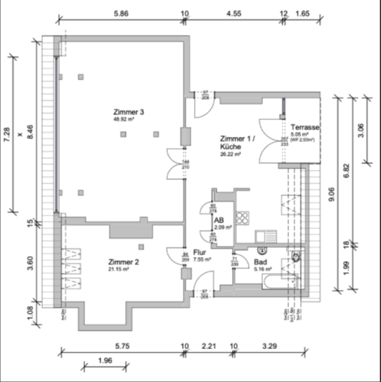 Auf ca. 113,62 m² Wohnfläche verteilen sich ein Eingangsbereich mit ausreichend Platz für eine Garderobe; ein renoviertes Badezimmer, ausgestattet mit einer Badewanne; ein Schlafzimmer mit viel Stellfläche für einen großen Kleiderschrank sowie mit einem praktischen Abstellraum; ein Essbereich mit direktem Zugang zur ca. 5,05 m² großen Terrasse sowie angrenzender und offen gestalteter Küche. Die Küche ist mit einer hochwertigen, modernen Einbauküche und Markengeräten ausgestattet, wie z.B. ein Backofen mit Dampfgarerfunktion von BOSCH, und bietet sehr viel Platz für Stauraum und Arbeitsflächen.