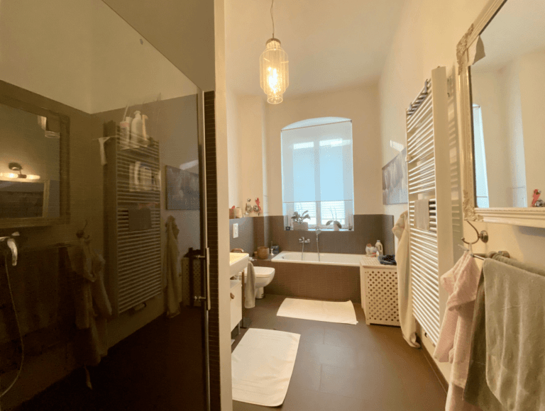 Die Wohnung ist im 1. Obergeschoss des Vorderhauses gelegen und überzeugt auf einer Wohnfläche von ca. 100 m². Diese verteilt sich auf drei Zimmer nebst einer Küche und einem Badezimmer.
