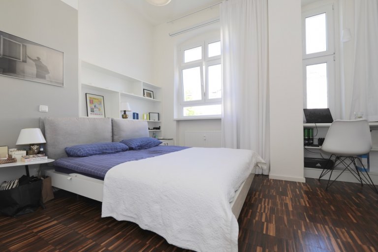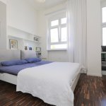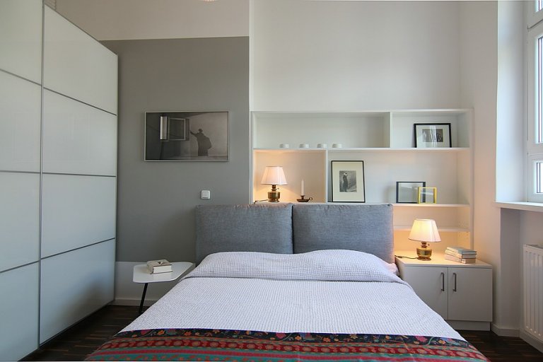 Im Schlafzimmer wurden die Flächen clever aufgeteilt mit ausreichend Platz für die Garderobe, als Stauraum oder als Arbeitsplatz.