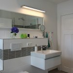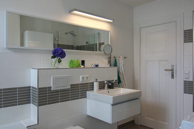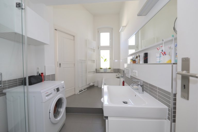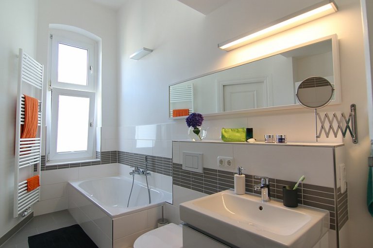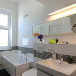 Das Badezimmer verfügt sowohl über eine Badewanne als auch über eine bodentiefe Dusche und ist sowohl vom Flur als auch als Bad en-suite vom Schlafzimmer aus begehbar. Klare Linien bestimmen auch Schlafzimmer und Bad, die beide durch ihr schlicht-elegantes Weiß und Grau bestechen.