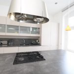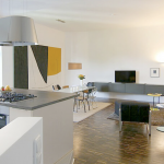 Der Industrie-Look der Küche mit Aluminiumfußboden, Edelstahlgeräten und Arbeitsplatten in Betonoptik setzt sich im Wohnraum mit dem Industrieparkett fort.