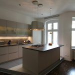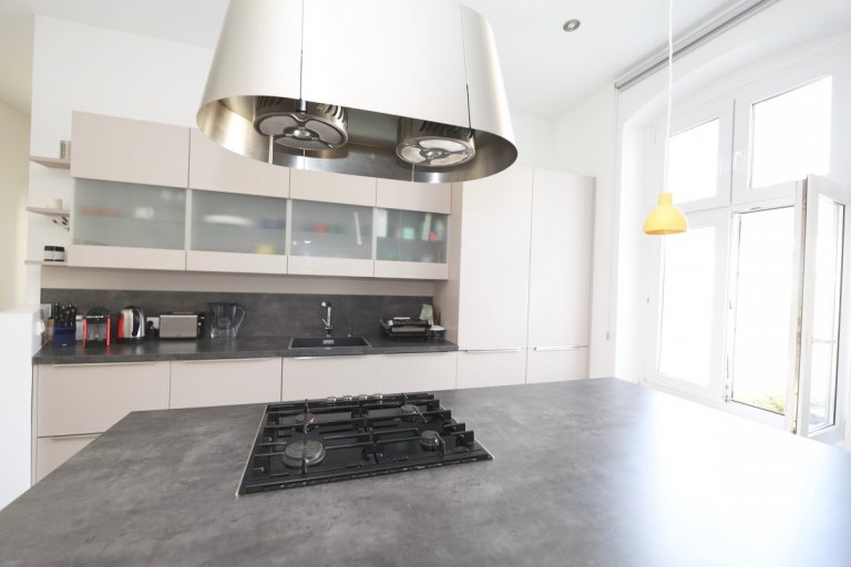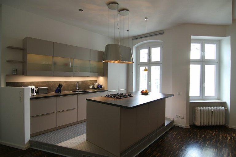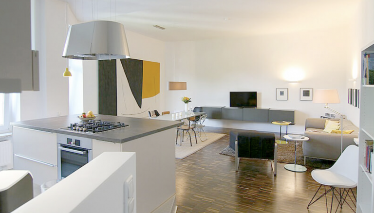 Mit offenem Grundriss und hohen Decken wird die Berliner Altbauwohnung überraschend zum Loft. Bei der Sanierung wurde komplett entkernt und die Raumfolge verändert. Dabei entstand ein großer Wohn- und Essbereich mit offener Küche auf einem etwas erhöhten Podest.