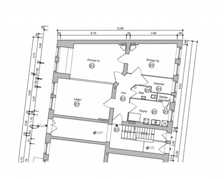 Die Wohnung befindet sich im Erdgeschoss des Vorderhauses und verfügt über eine Wohnfläche von ca. 82,78 m². Diese verteilt sich auf einen Flur, drei Zimmer nebst einer Küche, einer Abstellkammer und ein Badezimmer. Letztere sowie ein Schlafzimmer sind ruhig zum Innenhof ausgerichtet.