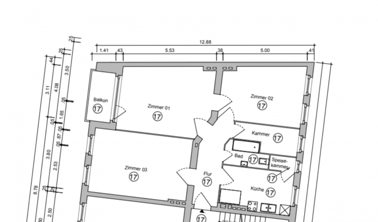 Der Grundriss ist gut aufgeteilt in Flur, Bad, Küche, Speisekammer sowie drei Zimmer nebst einem halben Zimmer. Zusätzlich verfügt die Wohnung über einen Balkon.