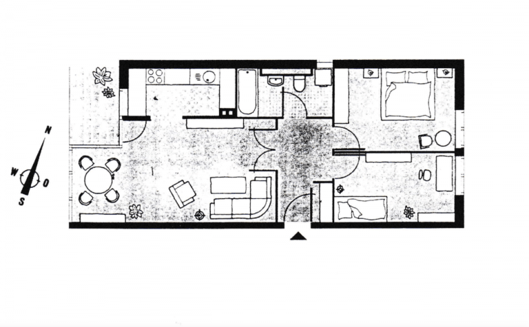 Der Flur bietet Zutritt zu allen Räumen der Wohnung. Rechts vom Eingang befinden sich ein Kinder- bzw. Arbeitszimmer und das Schlafzimmer - mit östlicher Ausrichtung.