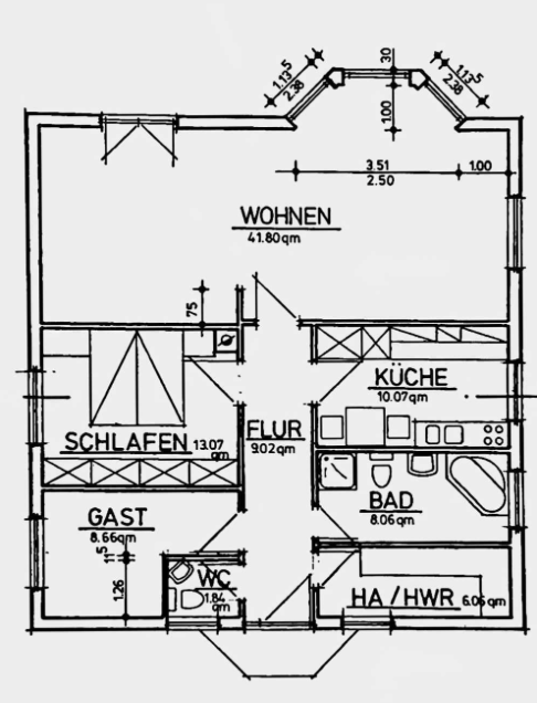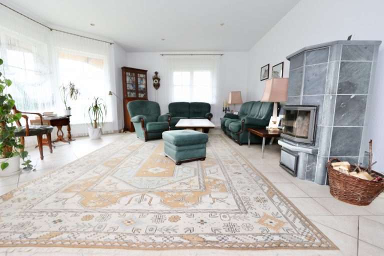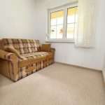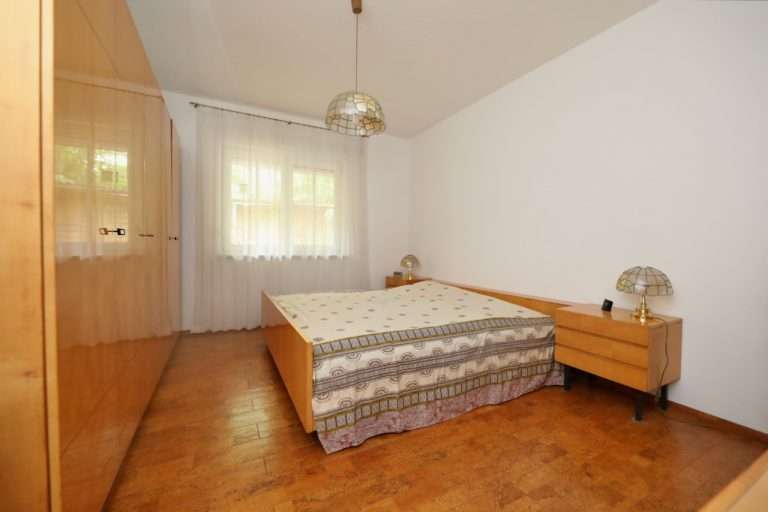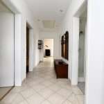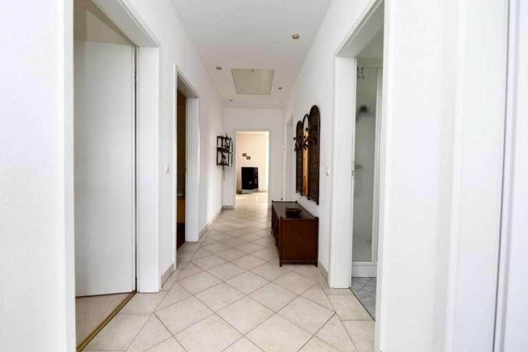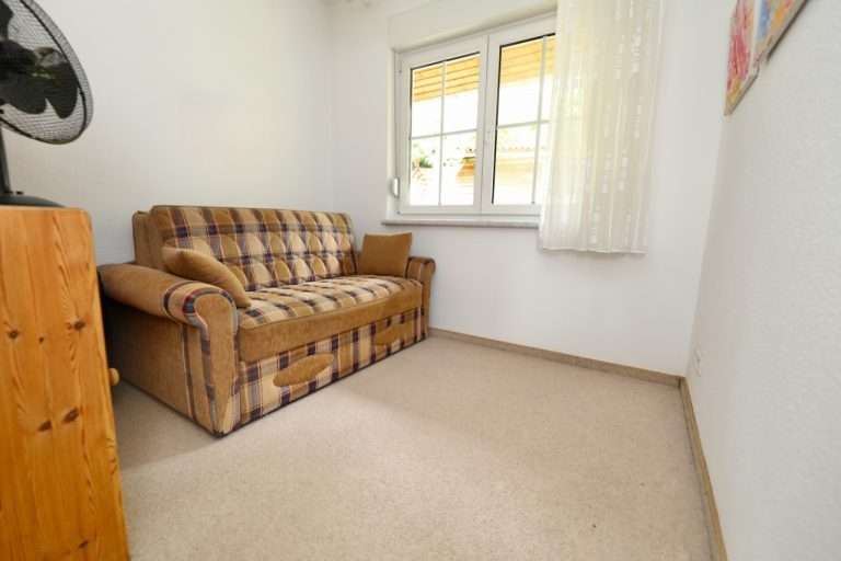 Der Flur und das Wohnzimmer sind mit modernen Fliesen ausgestattet, im größeren Schlafzimmer wurde Korkboden und im kleineren Schlafzimmer Auslegware verlegt. Die Kunststofffenster sind mit Rollläden versehen.