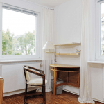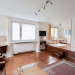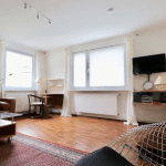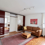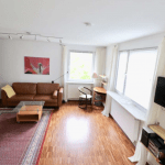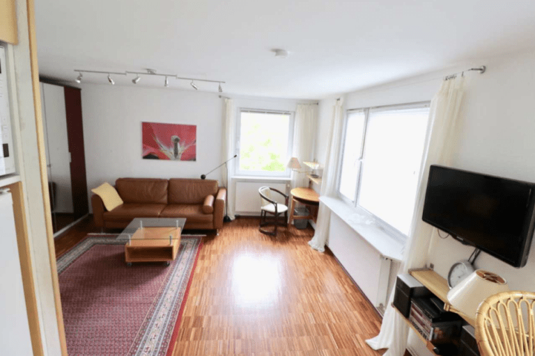 Die Wohnung, mit einer Wohnfläche von ca. 32 m², befindet sich im 4. Obergeschoss eines sehr ruhig gelegenen Mehrfamilienhauses. Die gemütliche, mit dunklem Merbauparkett ausgelegte Einzimmerwohnung wurde optimal gestaltet, um möglichst viel Platz zu gewinnen. Beim Betreten der Wohnung, gelangt man in das großzügige Zimmer, welches mit einem nach Westen und zwei nach Süden ausgerichteten dreifach-verglasten Fenstern ausgestattet ist.