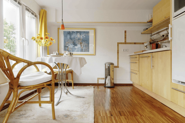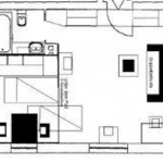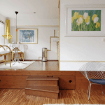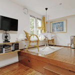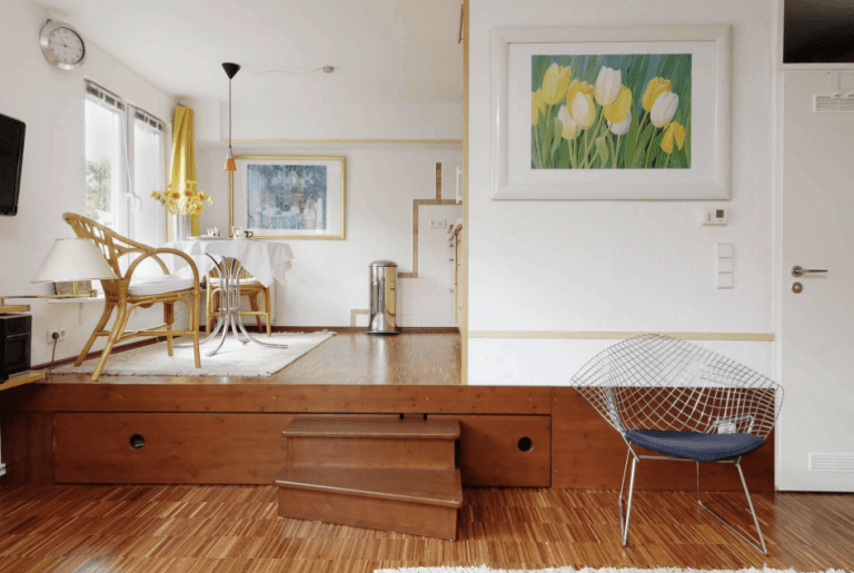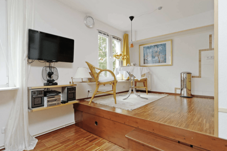 Die Wand der Eingangstür ist mit Einbauschränken ausgestattet, die optimalen Stauraum bieten. Eine weitere bauliche Raffinesse liegt unter dem Podest des Essbereichs, wo sich ein ausziehbares Bett mit den Maßen 160 x 200cm befindet.