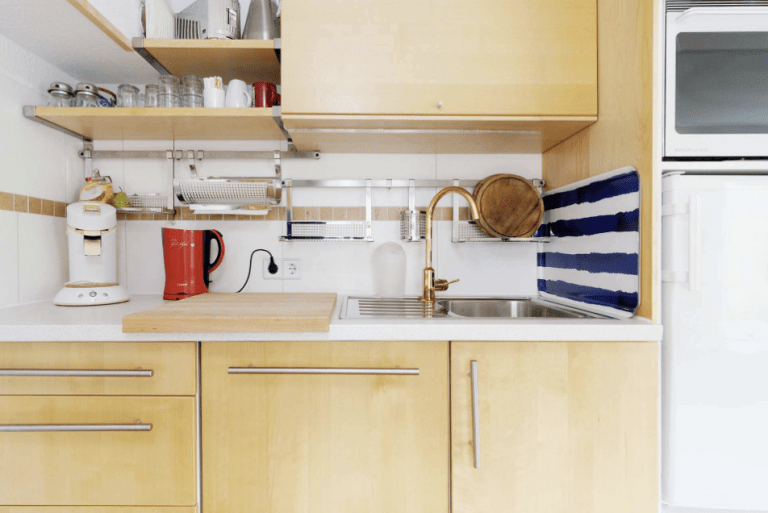 Eine Küchenzeile, die sich zum Wohnraum hin öffnet, bietet ausreichend Stauraum und Arbeitsfläche.
