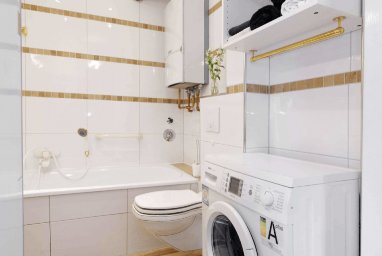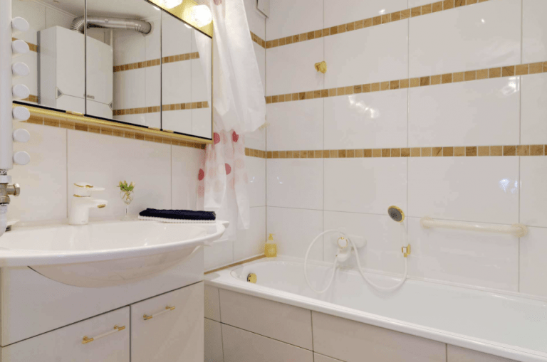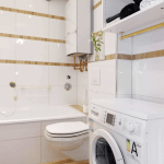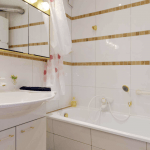 Unmittelbar neben dem Wohnungseingang befindet sich das hell geflieste Wannenbad, in dem sich auch die Waschmaschine befindet. Das Badezimmer ist mit hochwertigen Sanitärobjekten ausgestattet.