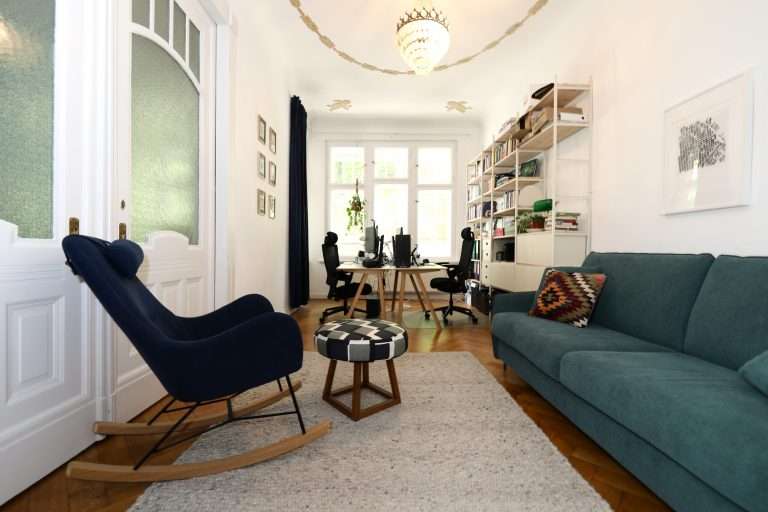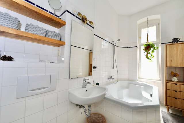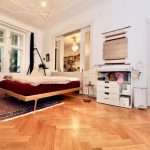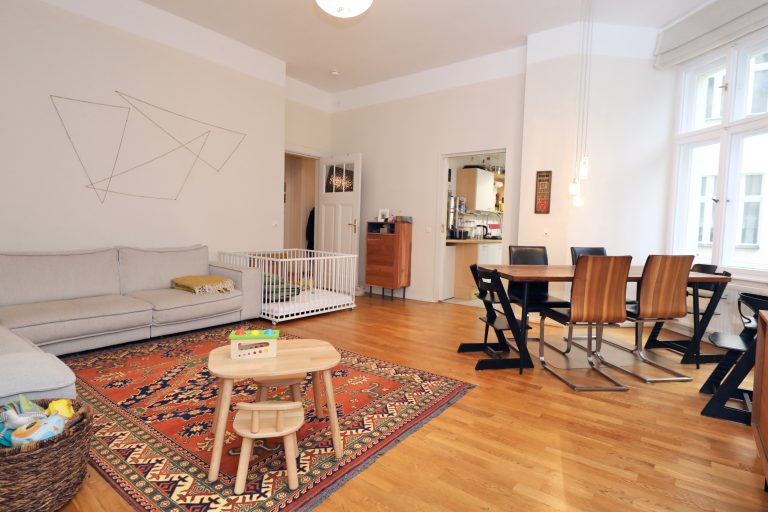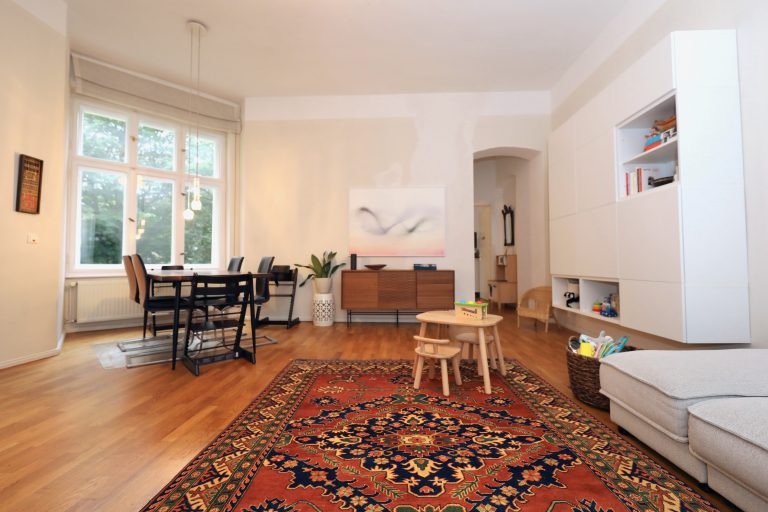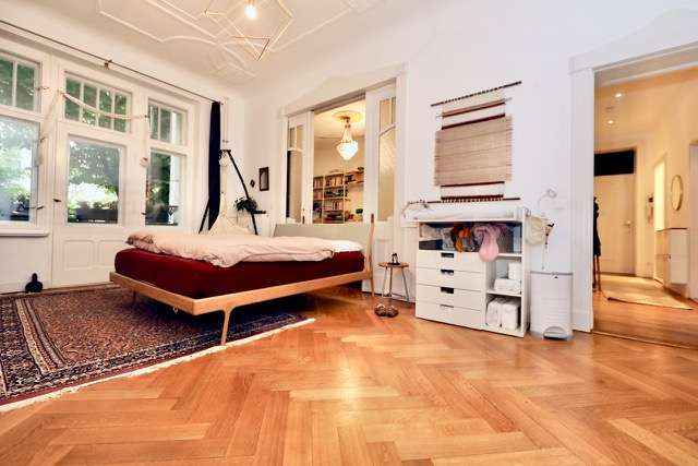 Eine Raumhöhe von etwa 3,40 Metern vermittelt ein sehr großzügiges Raumgefühl. Hochwertiger Parkettboden in Fischgrätenoptik, Flügeltüren, Doppelkastenfenster und originale Stuckverzierungen an den Decken unterstreichen den Altbaucharme.
