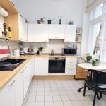 Die zum Wohnzimmer offen gehaltene Einbauküche bietet ausreichend Stauraum und Arbeitsflächen sowie Platz für einen Essbereich mit Blick in den begrünten Außenbereich.