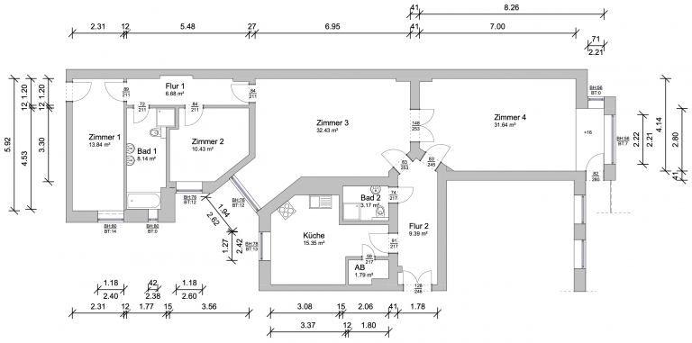 Auf einer Wohnfläche von ca. 132,86 m² verteilen sich zwei Flure; vier geräumige Zimmer; ein tagesbelichtetes Badezimmer mit Badewanne sowie separater, bodentiefer Dusche; ein Duschbad sowie eine Küche, die mit einer Einbauküche ausgestattet ist, und die zudem ausreichend Platz für einen großen Esstisch bietet. Eine praktische Abstellkammer in der Küche ist ebenfalls vorhanden.