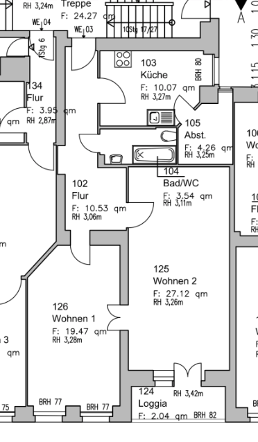 Die Wohnung verfügt über ca. 77,02 m², die sich aufteilen auf drei Zimmer, eine Küche, einen separaten Abstellraum und ein Badezimmer. Zudem ist eine nördlich ausgerichtete Loggia vorhanden.