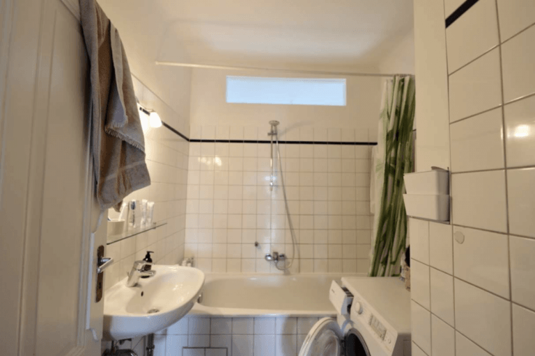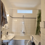 Vom Eingangsbereich befindet sich auf der linken Seite das modernisierte, hell geflieste Badezimmer, welches mit einer Badewanne ausgestattet ist. Dort befindet sich auch der Waschmaschinenanschluss. Das WC ist praktischerweise vom Badezimmer getrennt. Das großzügige Wohn-/Esszimmer ermöglicht den Zugang zur Küche, die mit einer modernen Einbauküche ausgestattet ist.