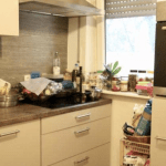 Die Küche ist ausgestattet mit einer hellen Einbauküche mit Spüle und elektrischen Geräten, wie dem Elektroherd mit bedienungsfreundlichem Ceranfeld sowie einen Backofen, der in ergonomischer Arbeitshöhe installiert wurde.
