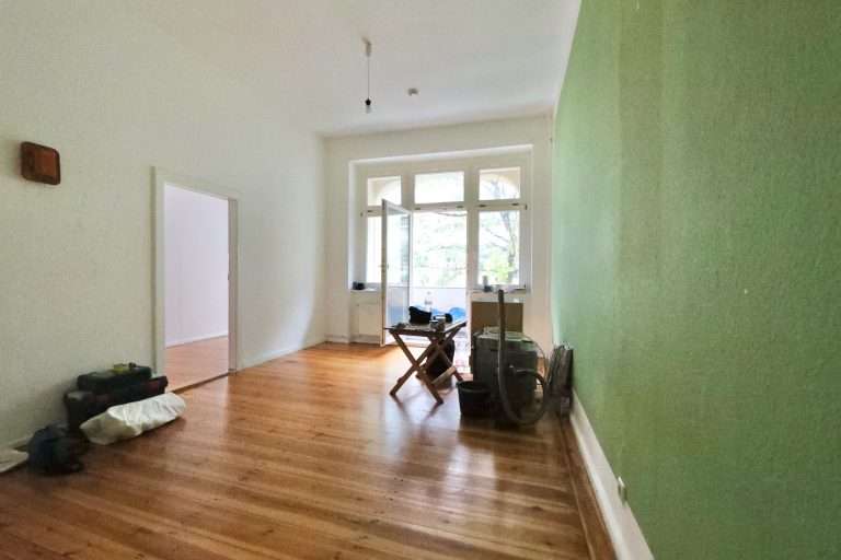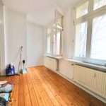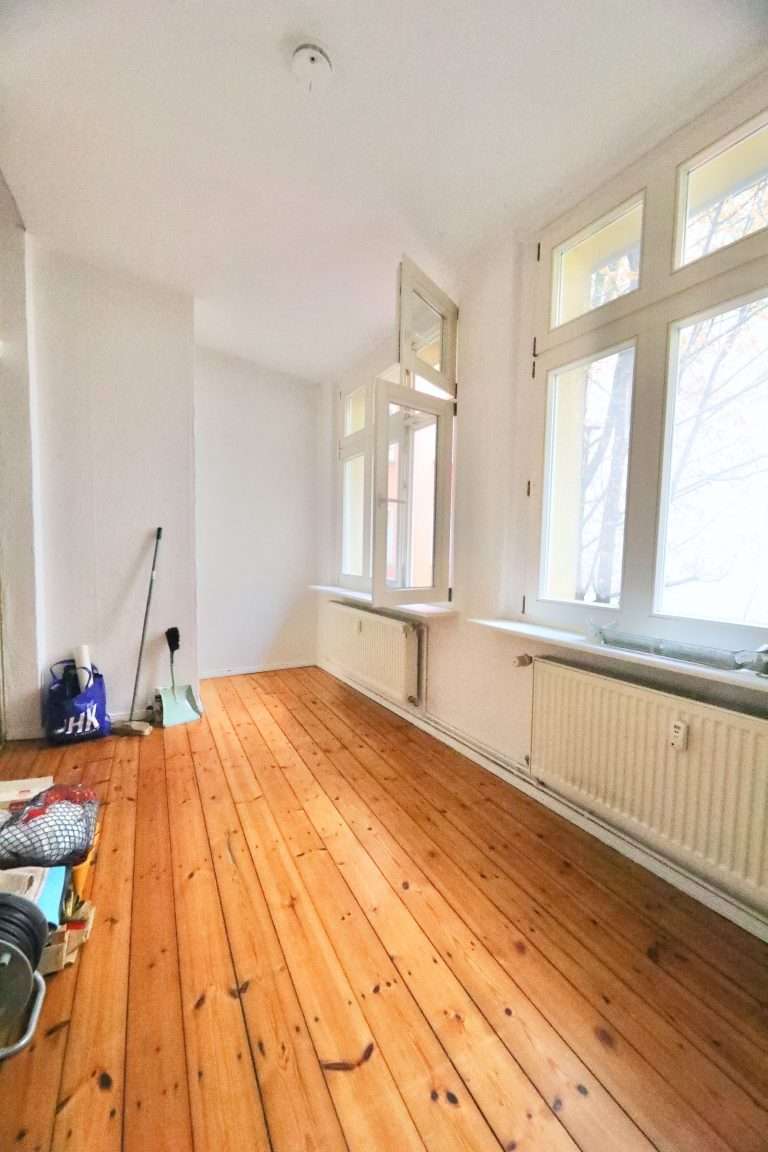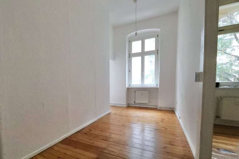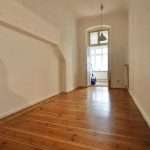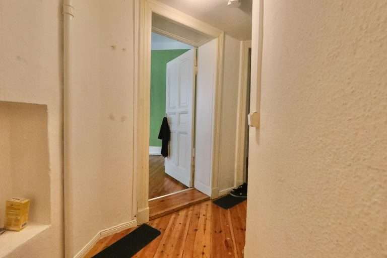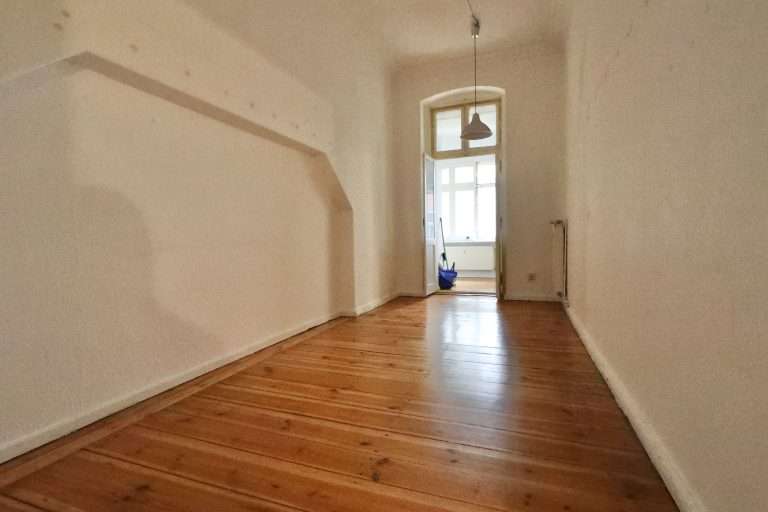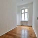 Die Wohnräume sind mit Holzdielen versehen. In einem Schlafzimmer ist noch originaler Stuck vorhanden. Die Wände sind tapeziert, und eine Deckenhöhe von ca. 3,40 m verleiht der Wohnung ein sehr großzügiges Raumgefühl. Die Holzfenster sind zweifach verglast und wurden 2024 überarbeitet.