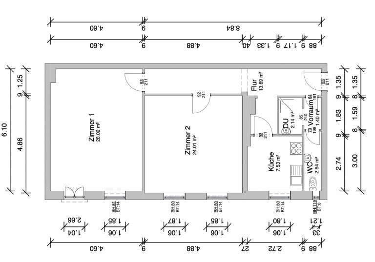 Die Wohnung beinhaltet eine Wohnfläche von ca. 75 m², die sich verteilt auf einen Flur, ein Badezimmer mit Dusche, ein separates WC, eine Küche, ein Schlafzimmer und ein Wohnzimmer.