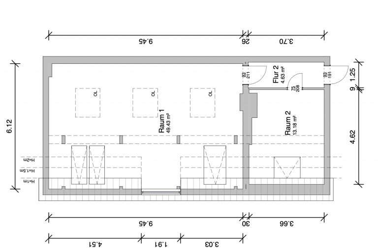 Die Dachgeschossebene verfügt über ca. 67,24 m² Nutzfläche. Die vielen Fensterflächen und Oberlichter vermitteln ein lichtdurchflutetes Raumgefühl.
