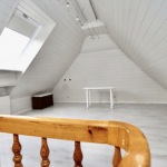 Eine geschwungene Holztreppe führt in das Obergeschoss, wo sich drei weitere Zimmer und ein großes, tagesbelichtetes Badezimmer befinden. Das Badezimmer ist ausgestattet mit einer Dusche und einem Handtuchwärmer. Der Spitzboden ist ausgebaut und bietet neben einer schönen Raumhöhe und viel Licht vielfältige Nutzungsmöglichkeiten.
