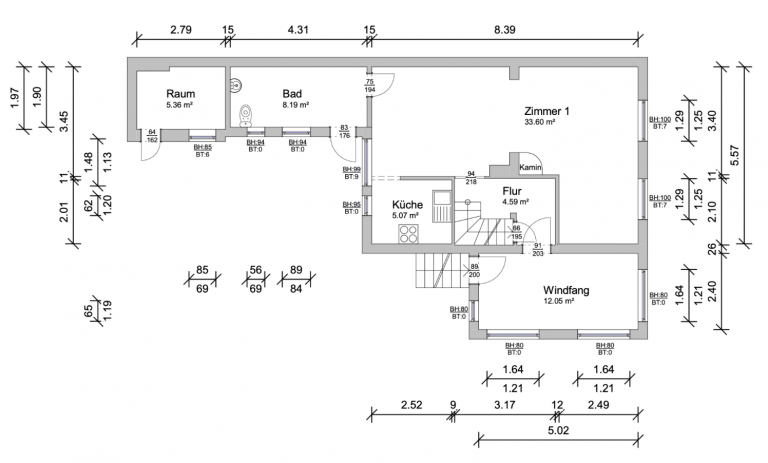 Das Erdgeschoss wird über einen Windfang betreten. Im Anschluss befndet sich der Flur; eine Küche, ausgestattet mit einer Einbauküche; das großzügige Wohnzimmer mit Kamin;