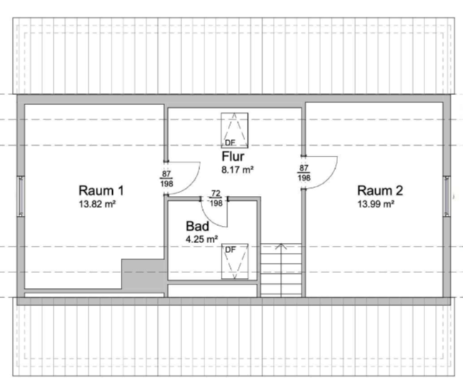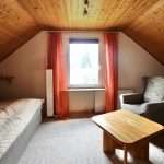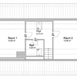 Das Obergeschoss ist über eine Holztreppe begehbar, und hier befinden sich ein Flur, zwei Schlafzimmer sowie ein weiteres, tagesbelichtetes Badezimmer, ausgestattet mit einer Badewanne.