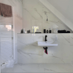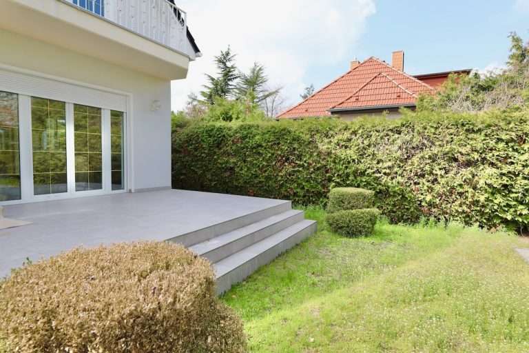 Über eine zentral positionierte, hochwertige Treppe mit edlen Marmorstufen ist das obere Geschoss zu erreichen. Hier befinden sich ein Schlafzimmer mit Badezimmer en-suite, welches mit einer Dusche ausgestattet ist; zwei Schlafzimmer sowie ein Badezimmer, ausgestattet mit einer Badewanne. Ein hübscher, zu Straßenseite ausgerichteter Balkon mit einem filigranen Metallgeländer unterstreicht den architektonischen Charakter. Ein weiterer, ca. 12 m² großer Balkon ist zum Gartenbereich ausgerichtet.
