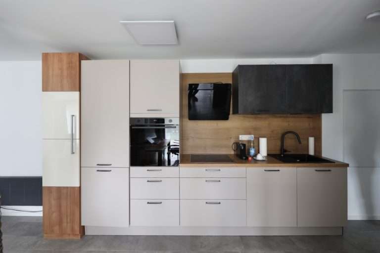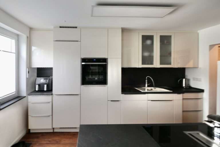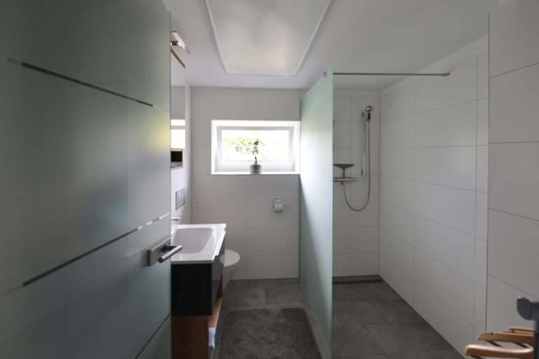 Im Hauptgebäude beträgt die Wohnfläche ca. 90,88 m². Hier befinden sich im Erdgeschoss ein einladender Eingangsbereich mit Kaminofen, welcher mittels Öl beheizt wird, sowie eine großzügige Wohnküche mit Kochinsel und hochwertiger Einbauküche. Die Wohnküche ist offen zum Wohn- und Essbereich gestaltet. Von hier aus besteht ein direkter Zugang zur großen Terrasse, die sich über die gesamte Breite des Hauses zieht. Das geräumige und tagesbelichtete Badezimmer verfügt über eine Dusche und Fußbodenheizung.