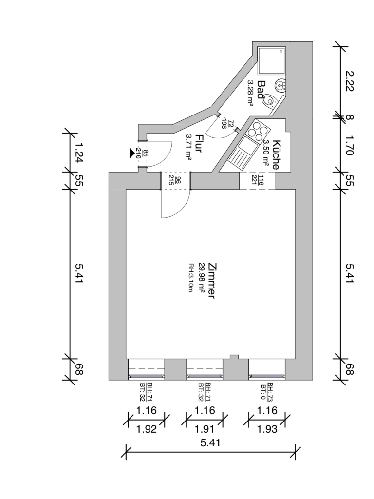Zudem verfügt die Wohnung über eine Deckenhöhe von 2,90 m und ist mit einem Parkettboden ausgestattet. Die Wände sind tapeziert, die Fenster sind aus Kunststoff und zweifach verglast.