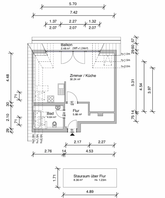 Die charmante Wohnung verfügt über ca. 45,34 m² Wohnfläche. Im Eingangsbereich steht genügend Platz für eine Garderobe zur Verfügung, zudem ist eine praktische Abstellnische vorhanden. Das Badezimmer ist mit einer Badewanne ausgestattet und verfügt über ein Fenster zur optimalen Belüftung. Das Herzstück der Wohnung ist das großzügige Wohnzimmer, über dessen breite Fensterfront sich ein länglich geschnittener, schmaler Balkon mit leichter Überdachung ausbreitet, der ein sehr helles und modernes Wohngefühl vermittelt und die Fläche des Wohnzimmers optisch erweitert.. Die offen geschnittene Küche ist geschickt in den Grundriss eingepasst.