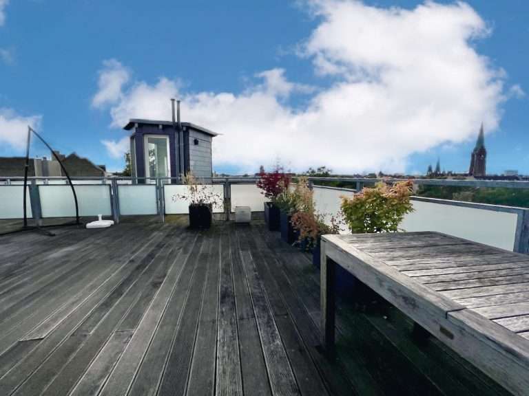 Die ca. 48,6 m² große Dachterrasse bietet nicht nur einen Blick über ganz Berlin, sondern auch einen erholsamen Bereich zum Entspannen, zum Sonnen oder als idyllischen Platz, um das Leben zu genießen.