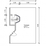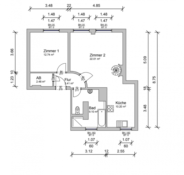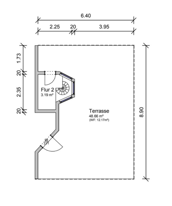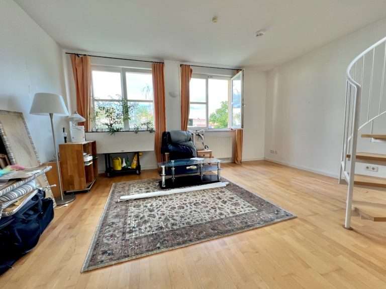 Auf ca. 75,3 m² verteilen sich ein Flur mit einem praktischen Abstellraum; ein großes Badezimmer, ausgestattet mit einer Badewanne und separater Dusche; ein geräumiges Schlafzimmer mit Einbauschränken sowie ein Wohnzimmer mit offener Küche und einer Wendeltreppe zur Dachterrasse.