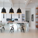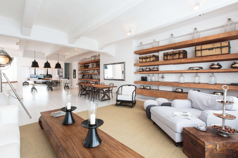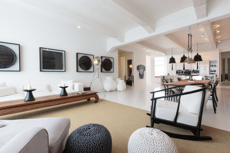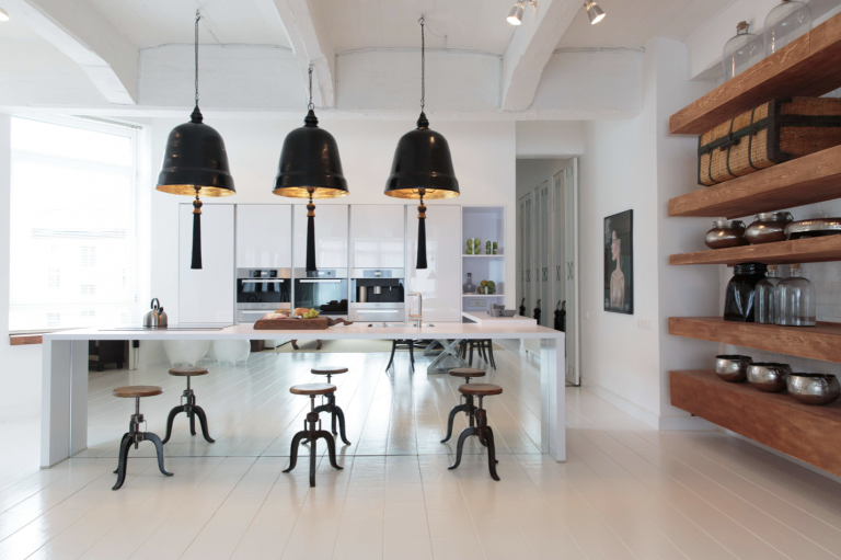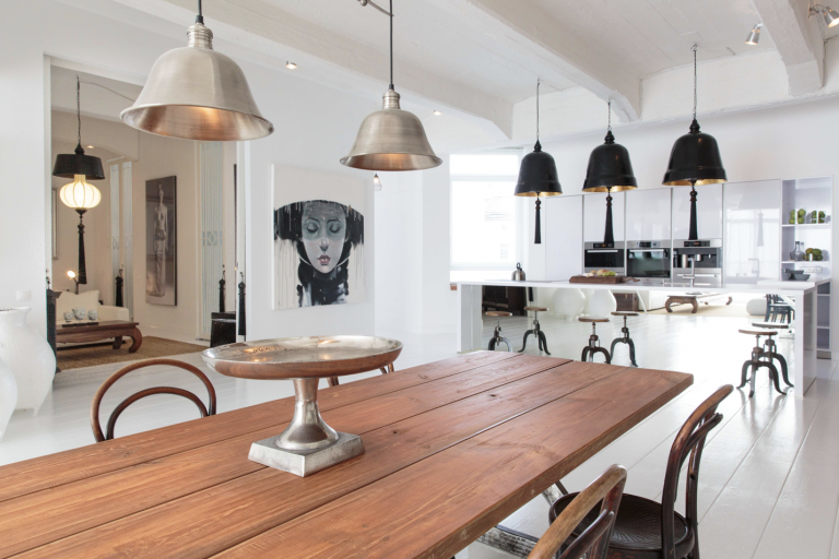 Vom Eingangsbereich aus gelangt man durch einen Flur in das loftartige Wohnzimmer mit offener Küche und Essbereich. Die hochwertige, moderne Einbauküche fügt sich stilvoll in das Gesamtbild ein.