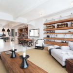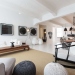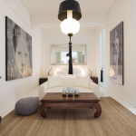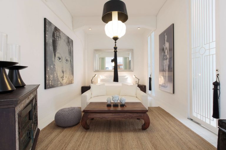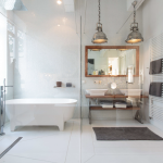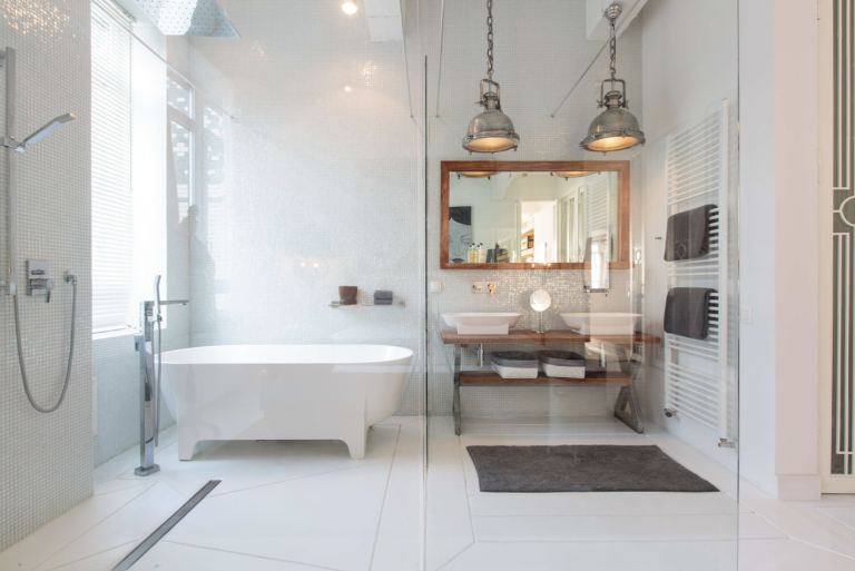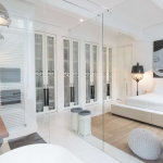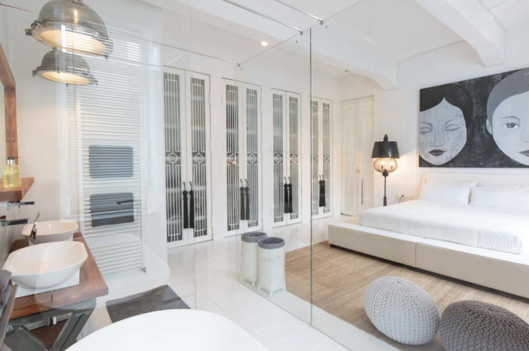 Durch eine elegante weisse Holztür mit Milchglaseinsätzen werden vom Wohnraum jeweils zwei Schlafzimmer mit Bad-en-Suite abgetrennt. Das Bad des einen Schlafzimmers ist ausgestattet mit einer Dusche, das Bad des anderen Schlafzimmers ist ausgestattet mit einer ebenerdigen Dusche und einer Badewanne. Das WC ist separat. Die Wände sind mit perlweißen Mosaikfliesen geschmückt.