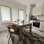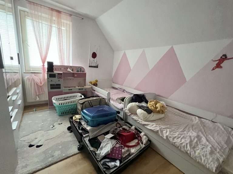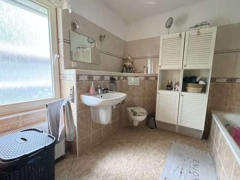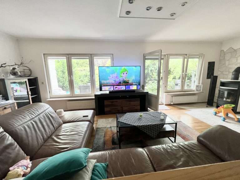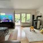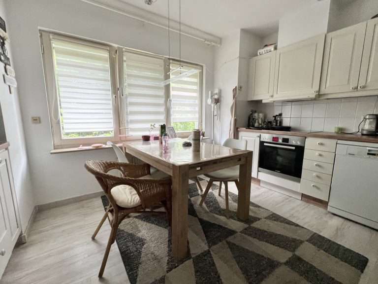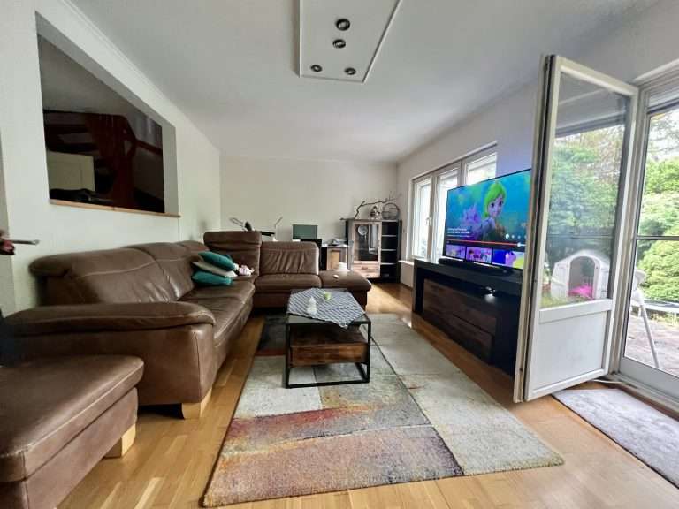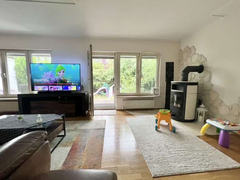 Eine Deckenhöhe von ca. 2,50 m verleiht ein angenehmes Raumgefühl. Die Wände sind tapeziert. Im Wohnzimmer ist ein Parkettboden und in den restlichen Wohnräumen sowie im oberen Badezimmer pflegeleichtes Laminat verlegt. Das Badezimmer im Erdgeschoss ist modern gefliest, und die Küche wurde mit einem Vinylboden ausgestattet. Die Holzfenster sind doppelt verglast, die Jalousien und die Markise sind elektrisch betrieben, und die Jalousien haben zudem Zeitschaltuhren.