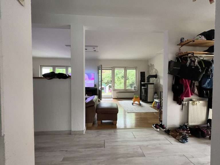 Im Erdgeschoss des Hauses sind der offene Eingangsbereich; eine Küche, ausgestattet mit einer Einbauküche mit Essbereich; ein tagesbelichtetes Badezimmer mit Badewanne und das großzügige Wohn-/Esszimmer untergebracht. Vom Wohnzimmer aus ist die Terrasse zu begehen, welche genügend Platz für gemütliche oder auch für gesellige Zeiten bietet. Diese verfügt zudem über eine praktische Markise. Ein Kaminofen im Wohnbereich sorgt im Winter für eine angenehme Atmosphäre.