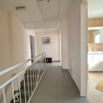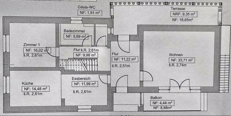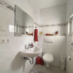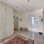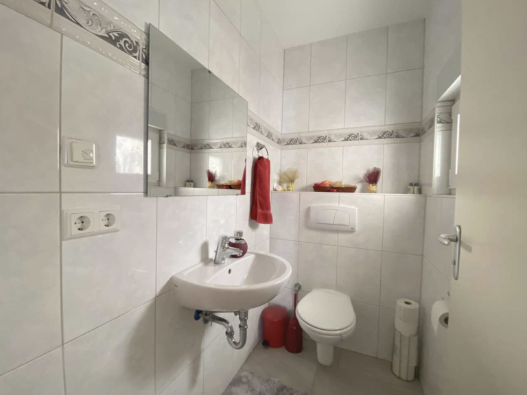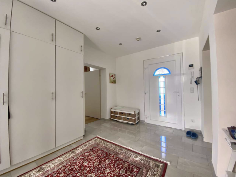 Der Eingangsbereich vermittelt einen hellen und großzügigen Eindruck. Die integrierte Garderobe und der Einbauschrank bieten viel Stauraum. Im Erdgeschoss befinden sich weiterhin das Wohnzimmer mit direktem Zugang zum Balkon, ein Arbeits-/Gästezimmer, ein Badezimmer mit Wannenbad sowie ein Gäste-WC.