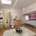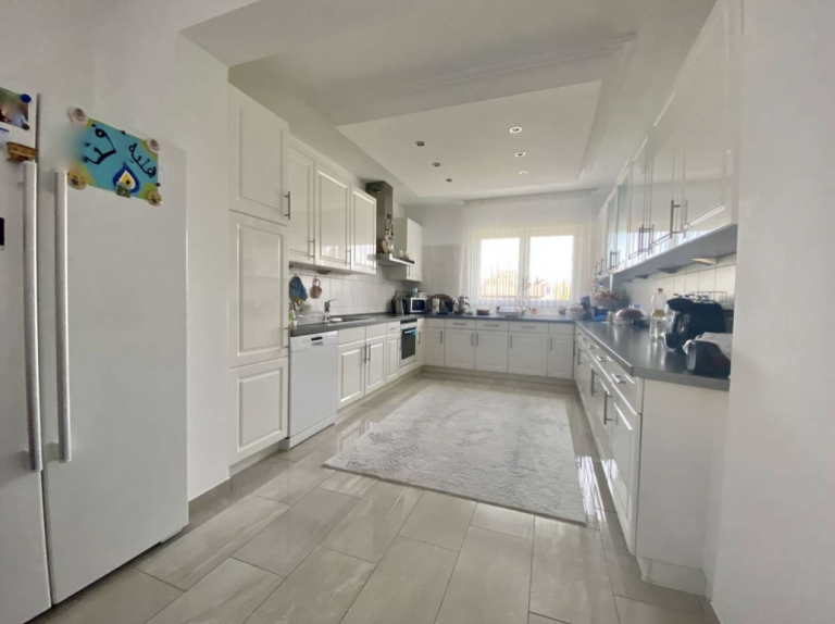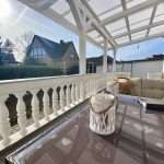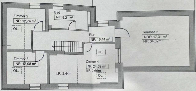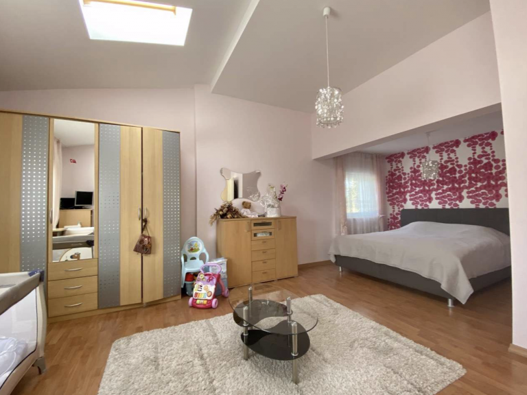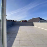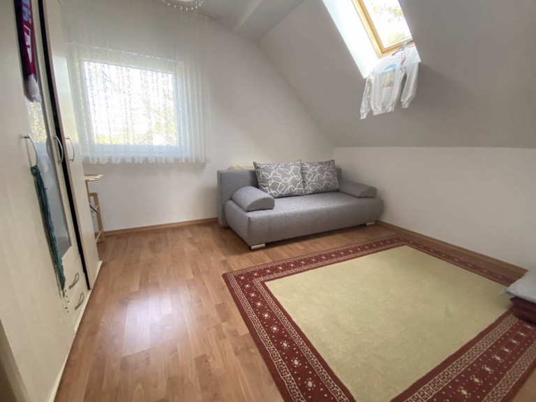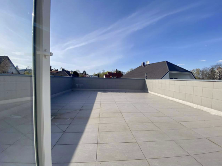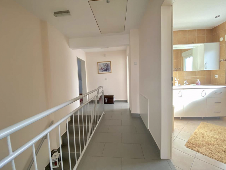 Über die Treppe im Eingangsbereich ist das Obergeschoss zu erreichen. Auf dieser Etage befinden sich ein großes Zimmer, welches sich als Masterbedroom mit Ankleidebereich eignet, und zwei weitere Zimmer, die sich als Kinderzimmer oder Arbeitszimmer anbieten. Das Badezimmer verfügt über eine geräumige Eckbadewanne. Vom Flur ist die beeindruckende Dachterrasse begehbar. Diese bietet vielfältige Nutzungsmöglichkeiten und lädt zu erholsamen und genussvollen Sommerabenden ein.