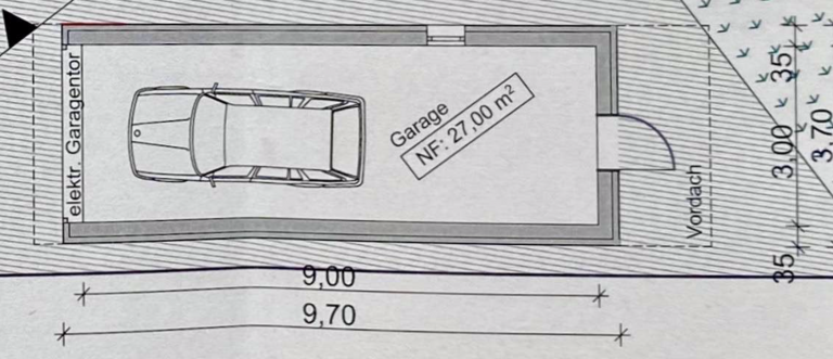 Eine große Garage mit elektronischem Rolltor bietet Platz für einen PKW.