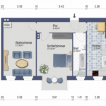 Eine Wohnfläche von ca. 69,78 m² verteilt sich auf einen Flur; eine Küche, ausgestattet mit einer Einbauküche und mit Waschmaschinenanschluss; ein tagesbelichtetes Badezimmer mit ebenerdiger Dusche, Handtuchwärmer und Doppelwaschbecken; ein geräumiges Schlafzimmer sowie ein großzügiges Wohnzimmer.