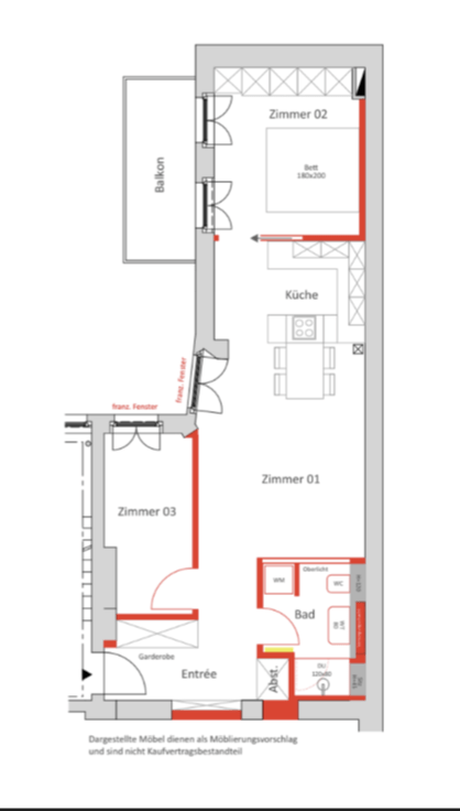 Es besteht die Möglichkeit, aus der Planung der 2-Zimmer-Wohnung eine 3-Zimmer-Wohnung zu erhalten, indem vom Wohn-/Essbereich ein kleineres Zimmer abgeteilt wird.