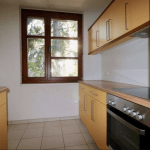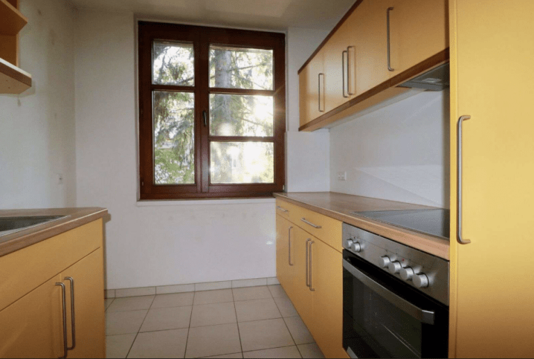 Vom Eingangsbereich aus links befindet man sich gleich in der Küche. Ausgestattet ist diese mit einer Einbauküche und einem Fenster. Ein Durchbruch zwischen Küche und Wohnzimmer wäre möglich.