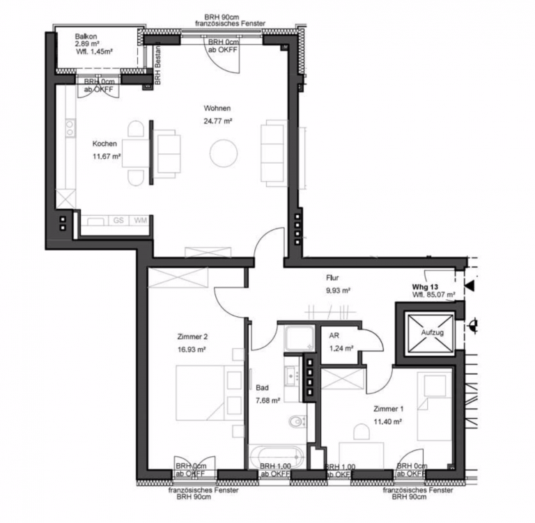 - alle straßenseitigen Fenster haben jeweils einen Öffnungsflügel mit Dreh-/Kippbeschlag und sind dreifach verglast
