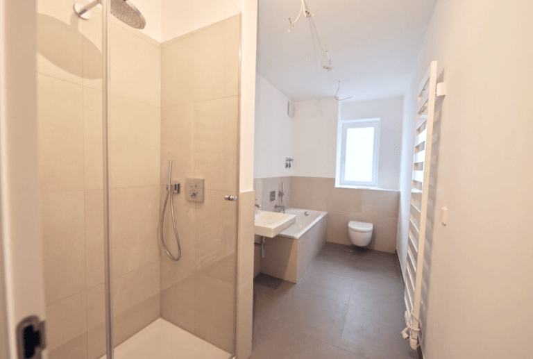 Der Eingangsbereich bietet Platz für die Garderobe. Zur wenig befahrenen Straße ausgerichtet befinden sich insgesamt drei Schlafzimmer, ein Badezimmer mit Badewanne und separater Dusche und der Küchenbereich.